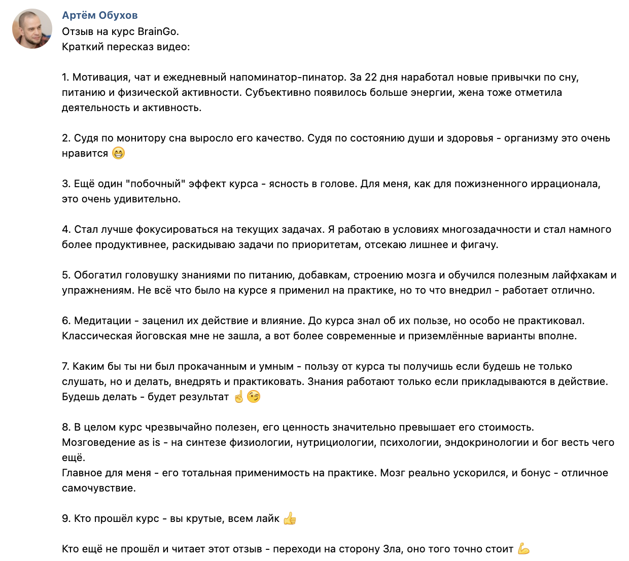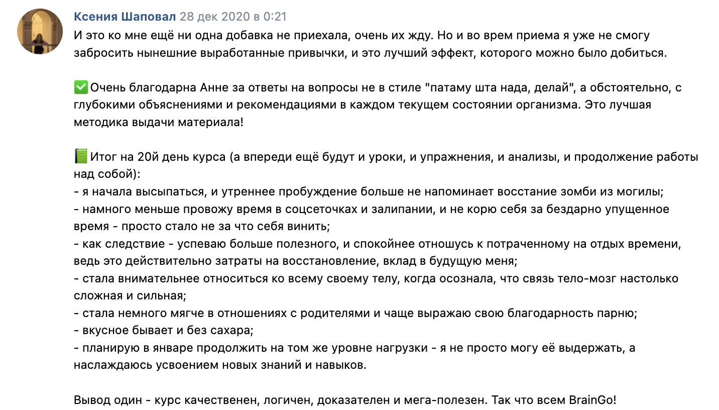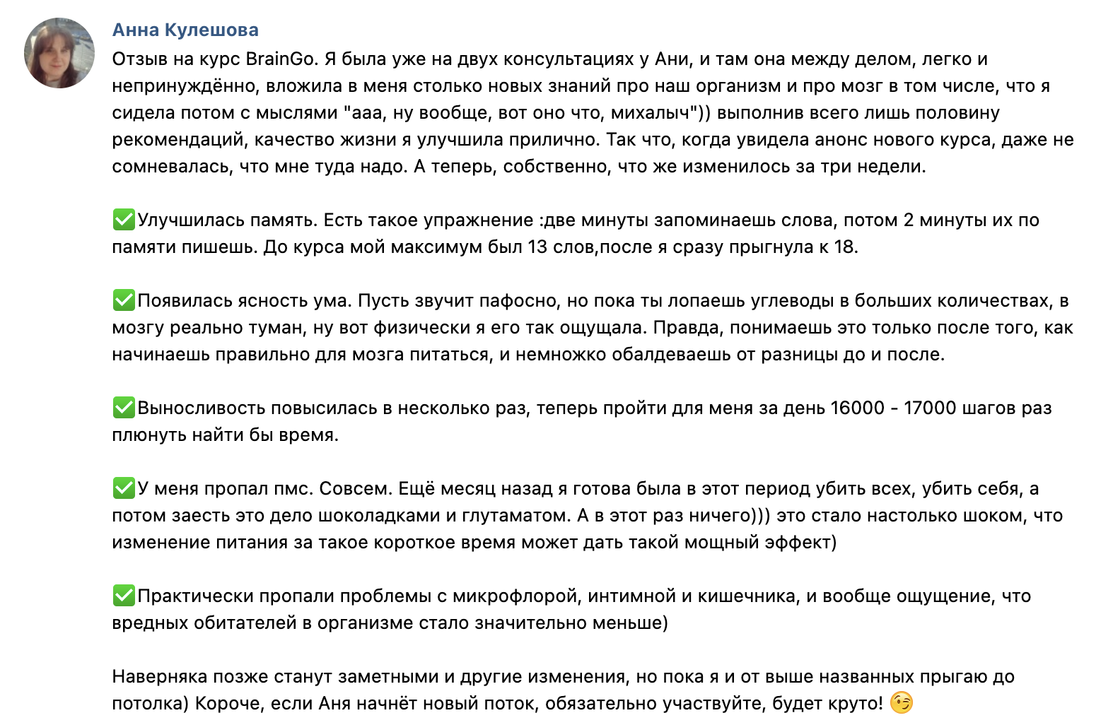 Срывы и “откаты” — это часть пути, а не провал. Система BrainGO построена с учётом “живых людей”, у которых не всегда всё идёт по плану. Даже если что-то не получится сейчас — ты сможешь вернуться к урокам в любой момент (доступ к материалам сохраняется на 3 месяца), получить поддержку, задать вопрос. Опыт показывает: если не сдаваться, а делать хотя бы минимум — изменения становятся стабильными. Мы даём не временные “диеты”, а механизмы управления своим состоянием на годы вперёд.