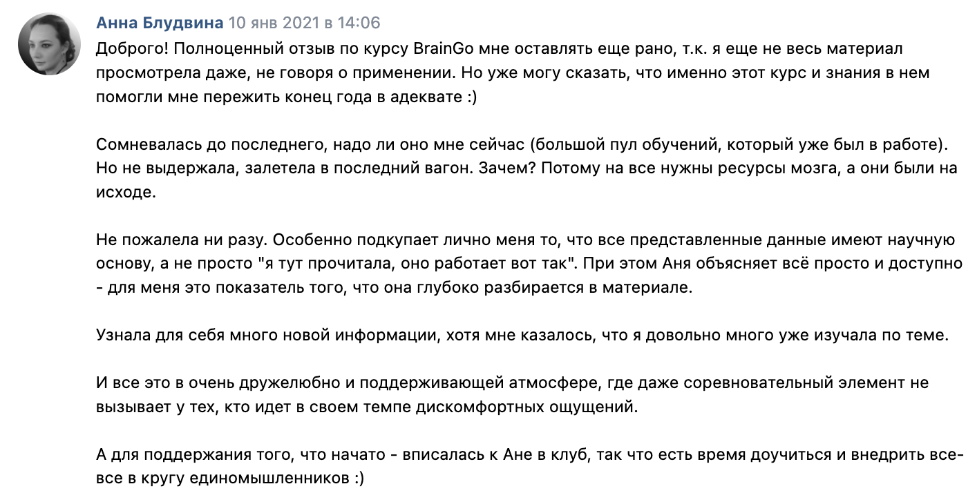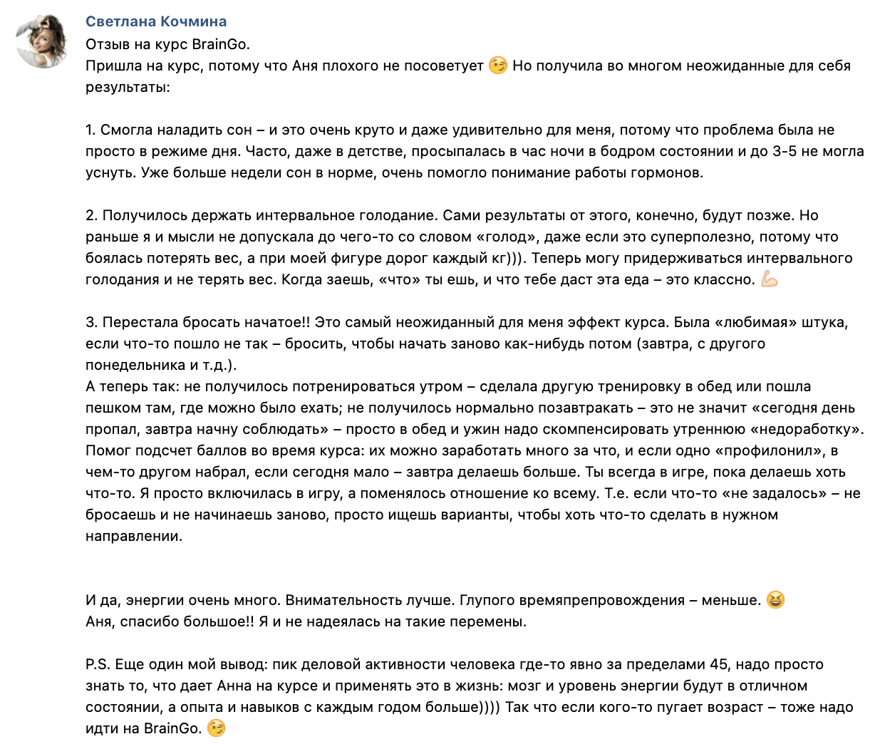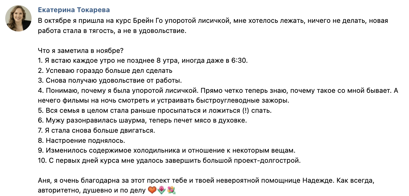 Срывы и “откаты” — это часть пути, а не провал. Система BrainGO построена с учётом “живых людей”, у которых не всегда всё идёт по плану. Даже если что-то не получится сейчас — ты сможешь вернуться к урокам в любой момент (доступ к материалам сохраняется на 3 месяца), получить поддержку, задать вопрос. Опыт показывает: если не сдаваться, а делать хотя бы минимум — изменения становятся стабильными. Мы даём не временные “диеты”, а механизмы управления своим состоянием на годы вперёд.