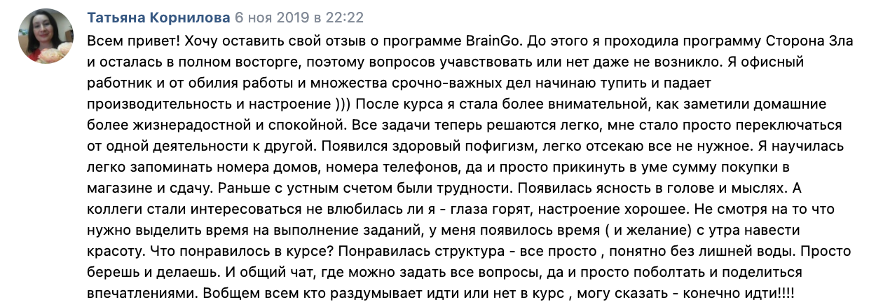 Применяя практики BrainGO, уже к концу первой недели чувствуешь внутреннее спокойствие — уходит раздражительность, возвращается уверенность и “ровное” настроение.