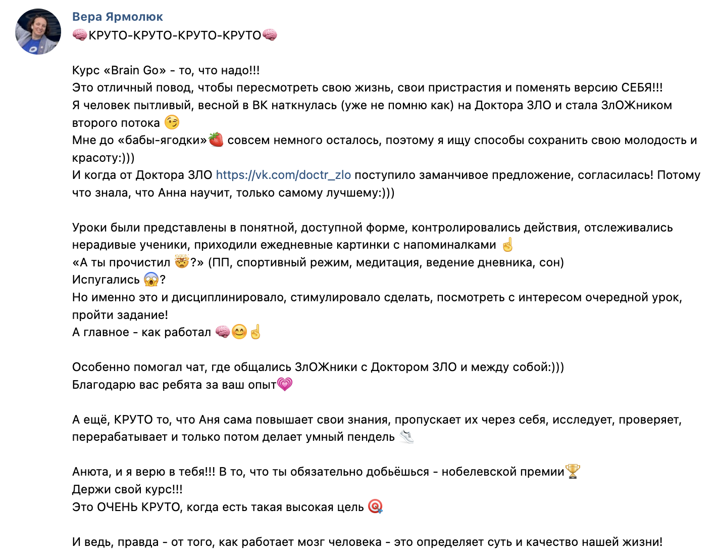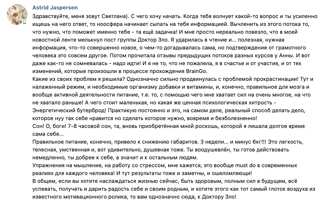 BrainGO — авторская система доктора ЗЛО (Анны Злобиной), врача и нутрициолога с реальным медицинским и международным опытом, плюс десятки научных методик и личных кейсов. Курс не продаёт “волшебную таблетку” — а даёт пошаговый план, учитывающий реалии жизни (стресс, ночь, быстрая еда, дети, работа). Ты получаешь не просто лекции, а целую экосистему: поддержка, разбор твоих вопросов, личный опыт и честные научные объяснения без воды. Сомневаешься? Почитай отзывы — люди действительно меняют качество жизни, даже если раньше ни одна “марафонская” попытка не работала.